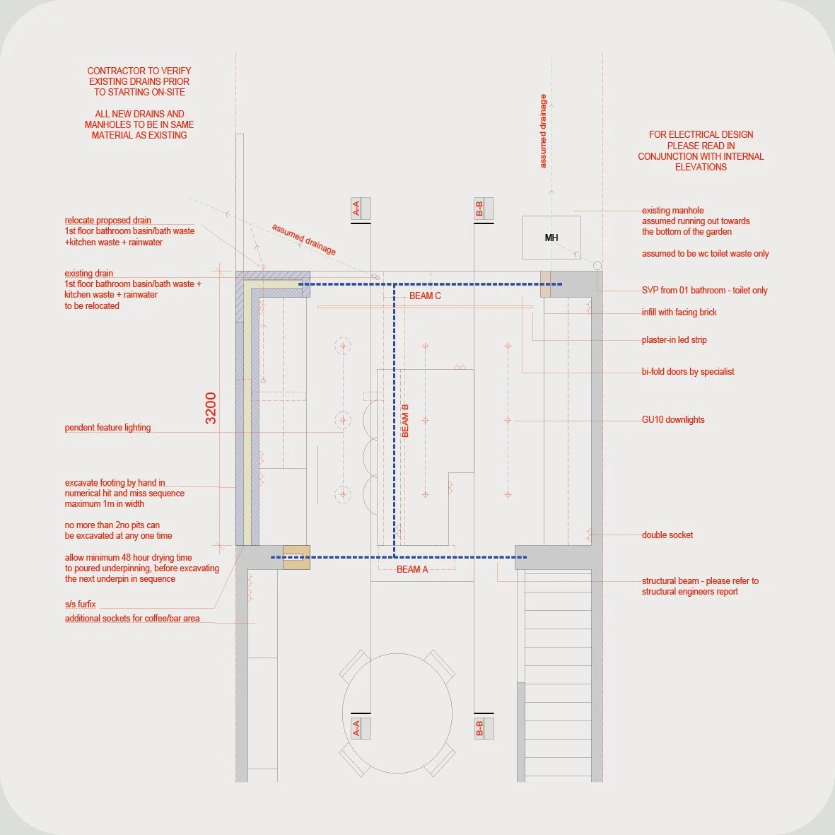 The infill extension ingeniously opens up the narrowexisting kitchen, seamlessly integrating with the outdoors through bi-fold doors opening onto the rear garden. The design aims for a harmonious blend of contemporary aesthetics and Victorian charm.